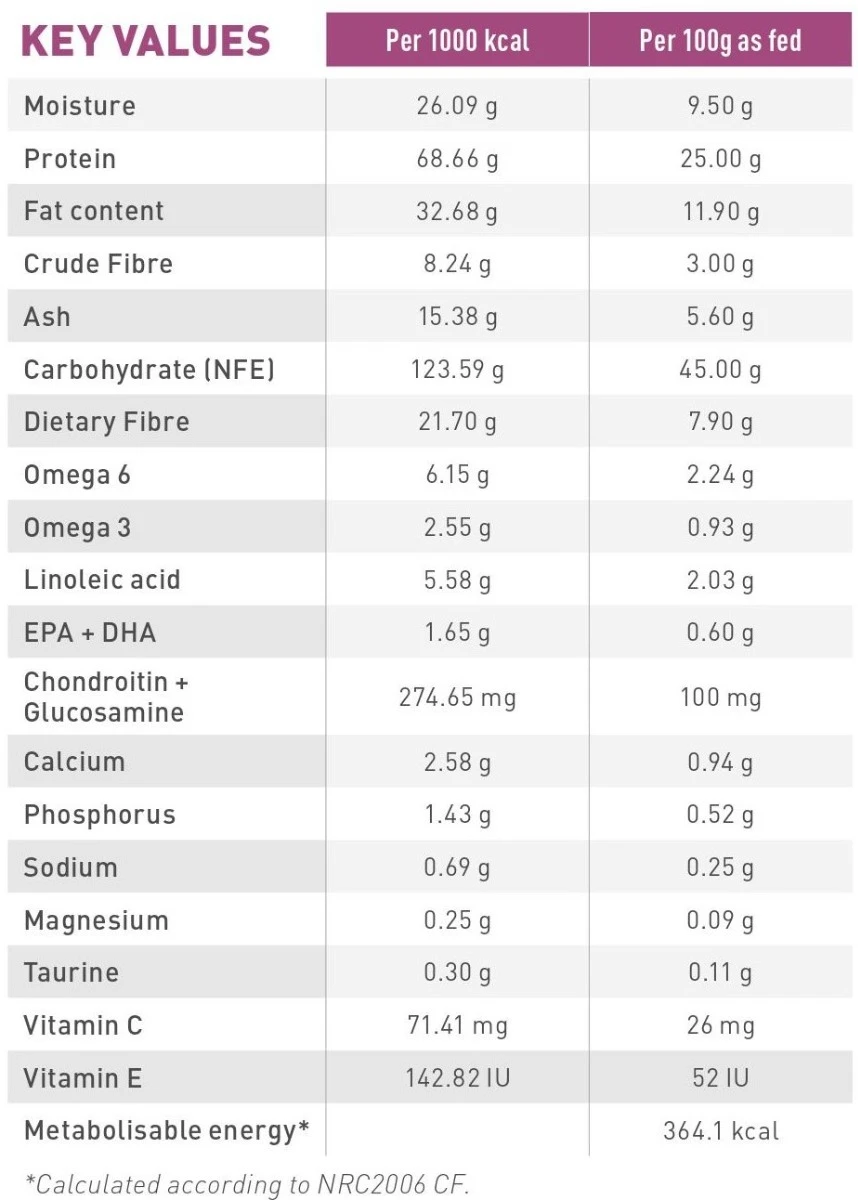 Daarnaast bevat de Mobility Support Diet range een matig gehalte aan calorieën om de gewrichten die belast worden door teveel gewicht te ondersteunen en het ideale gewicht te behouden.